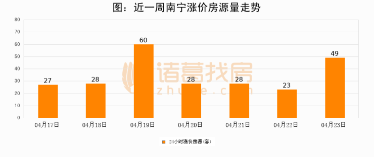 根据诸葛找房数据显示,南宁24小时涨价房源量为49套,较04月22日增加26套,环比上涨113%。与此同时,涨价房源占比小幅扩大,业主信心有所提升。