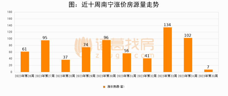 从调价房源来看,第35周南宁涨价房源7套,较上周下降93.1%。与此同时,35周涨价房源占比回落3.29个百分点,业主信心小幅波动,购房者可则需入市。