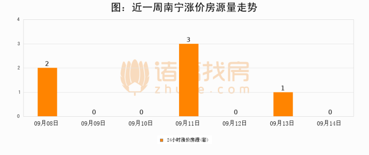 根据诸葛找房数据显示,南宁24小时涨价房源量为0套,较09月13日减少1套,环比下降100%。与此同时,涨价房源占比小幅回落,对于购房者来说是一个入市窗口期,购房者可抓住时机入市。