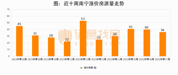 从调价房源来看,第47周南宁涨价房源36套,较上周下降10%。与此同时,47周涨价房源占比回落1.25个百分点,业主信心小幅波动,购房者可则需入市。