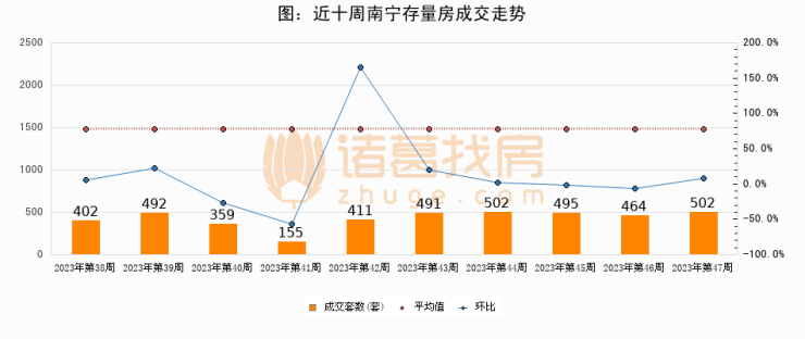 存量房方面,第47周南宁存量房成交502套,较上周增加38套,环比上涨8.2%。从近十周成交走势来看,周均成交套数为427套,本周高于平均水平17.6%。