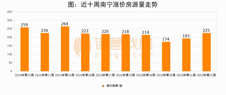 从调价房源来看,第32周南宁涨价房源225套,较上周上涨16.6%。与此同时,32周涨价房源占比提升0.05个百分点,业主信心持续恢复。