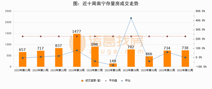 存量房方面,第32周南宁存量房成交738套,较上周增加4套,环比上涨0.5%。从近十周成交走势来看,周均成交套数为745套,本周低于平均水平0.9%。