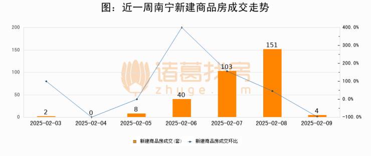 根据南宁市住房和城乡建设局数据显示,2025年02月09日南宁新建商品房成交4套,较昨日减少147套,环比下降97.4%。近一周南宁新建商品房日均成交44套。02月09日单日成交4套,低于近一周平均水平90.9%。