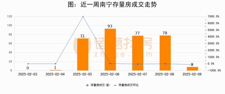 从存量房来看,2025年02月09日南宁存量房单日成交8套,比昨日减少70套,环比下降89.7%。从近一周存量房成交来看,南宁存量房日均成交套数为46套,02月09日单日成交8套,低于近一周平均水平82.6%。