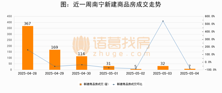 根据南宁市住房和城乡建设局数据显示,2025年05月04日南宁新建商品房成交7套,较昨日减少25套,环比下降78.1%