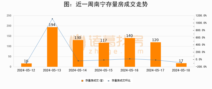 从存量房来看,2024年05月18日南宁存量房单日成交17套,比昨日减少103套,环比下降85.8%。从近一周存量房成交来看,南宁存量房日均成交套数为104套,05月18日单日成交17套,低于近一周平均水平83.7%。