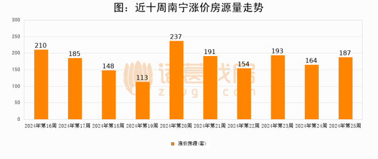 从调价房源来看,第25周南宁涨价房源187套,较上周上涨14%。与此同时,25周涨价房源占比提升0.53个百分点,业主信心持续恢复。