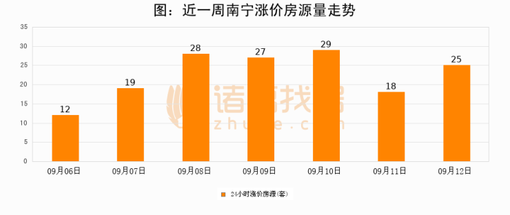 根据诸葛找房数据显示,南宁24小时涨价房源量为25套,较09月11日增加7套,环比上涨38.9%。与此同时,涨价房源占比小幅扩大,业主信心有所提升。