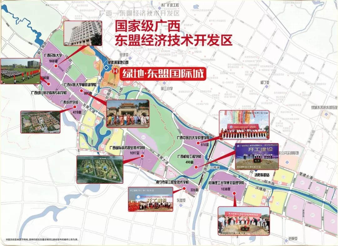➽例如教育园区建设。截止目前,绿地东盟国际城所处的教育园区西片区已签约学校11所。广西民族大学及广西民族大学相思湖学院、广西机电工程学校、桂林理工大学博文管理学院、广西国际商务职业技术学院、广西中医药大学护理学院,6所学校开工建设。其余签约高校,也在陆续开工建设。