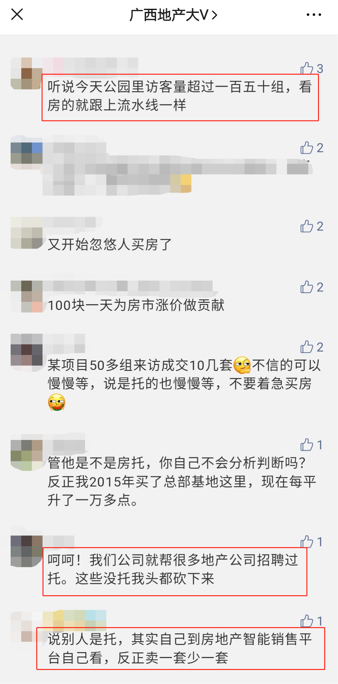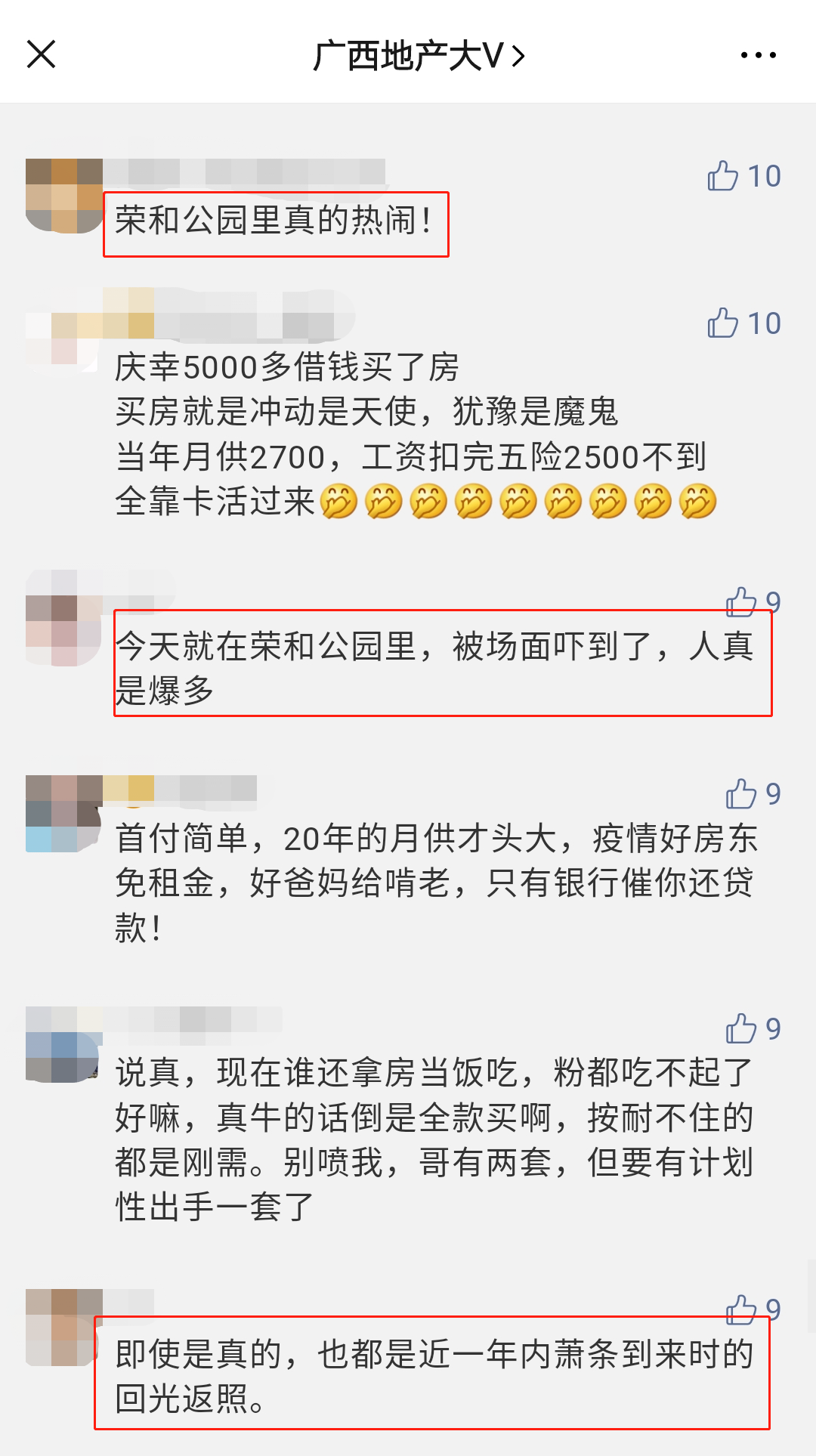 丨3月南宁商品住宅成交量价齐跌(图源克而瑞)楼市整体不乐观的情况下,荣和公园里却很反常,它逆势而上。大V君了解到:3月荣和公园里就有1760组购房者到访,卖房261套,销售额突破2.4亿元。这个销售成绩,别说是在疫情期间,就是放在平时,也是相当不错的。不少人好奇,疫情期间诞生的热销红盘——荣和公园里,为什么既不在红盘聚集地五象湖,也不在大热的五象南、凤岭三岸滨江板块,而是位处江南的沙井板块?先来看一组地产大V评论区的截图: