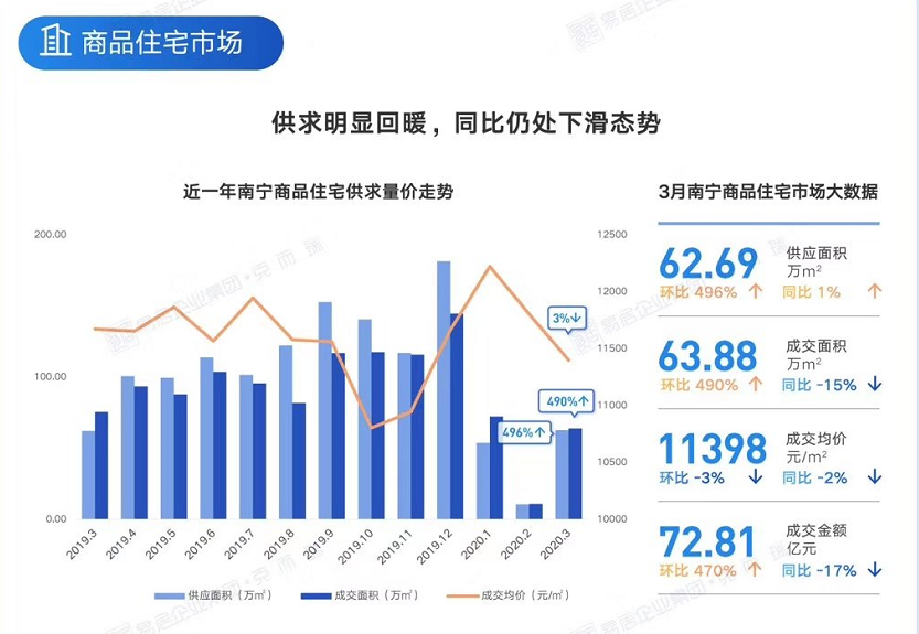 疫情之下江南楼盘一个月卖房261套!3月,疫情的影响仍未完全退散,特别是楼市。虽然项目复工、售楼部相继重启,楼市逐渐回暖迹象,但成交量下跌也是事实。贝壳研究院4月2日发布的报告称,今年一季度,其监测的66个大中城市新房总成交面积与成交套数分别为4247万㎡、37万套,累计同比分别下滑28.6%、30.7%。南宁也是如此。克而瑞广西片区数据显示,南宁3月商品住宅成交面积为63.88万㎡、成交额72.81亿,同比分别下降了15%、17%。
