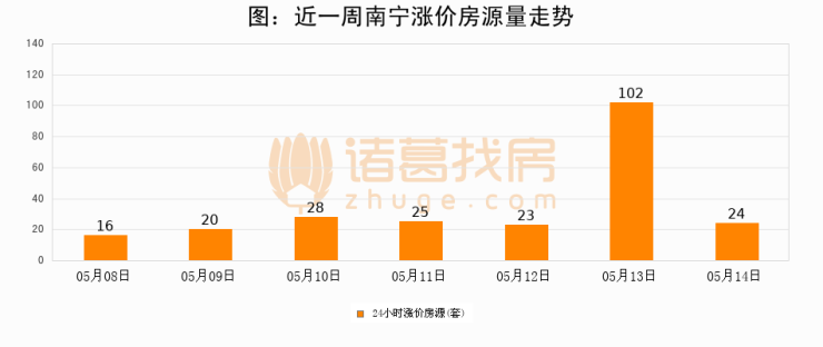 根据诸葛找房数据显示,南宁24小时涨价房源量为24套,较05月13日减少78套,环比下降76.5%。与此同时,涨价房源占比小幅回落,对于购房者来说是一个入市窗口期,购房者可抓住时机入市。