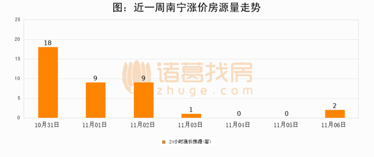 根据诸葛找房数据显示,南宁24小时涨价房源量为2套,较11月05日增加2套,环比上涨0%。与此同时,涨价房源占比小幅扩大,业主信心有所提升。