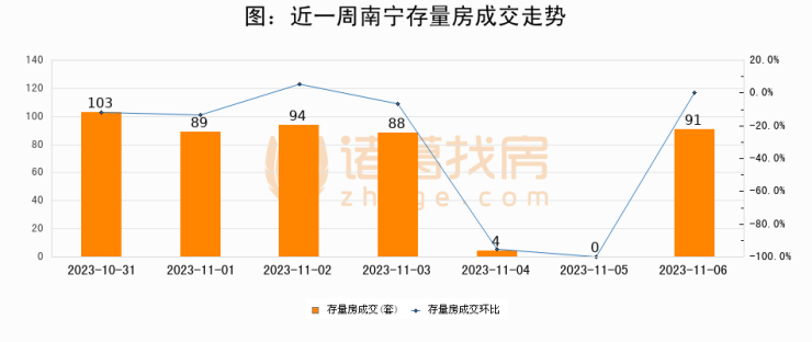 从存量房来看,2023年11月06日南宁存量房单日成交91套,比昨日增加91套,环比上涨0%。从近一周存量房成交来看,南宁存量房日均成交套数为67套,11月06日单日成交91套,高于近一周平均水平35.8%。