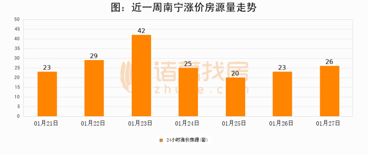 根据诸葛找房数据显示,南宁24小时涨价房源量为26套,较01月26日增加3套,环比上涨13%。与此同时,涨价房源占比小幅扩大,业主信心有所提升。