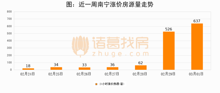 根据诸葛找房数据显示,南宁24小时涨价房源量为637套,较02月29日增加111套,环比上涨21.1%。与此同时,涨价房源占比小幅扩大,业主信心有所提升。
