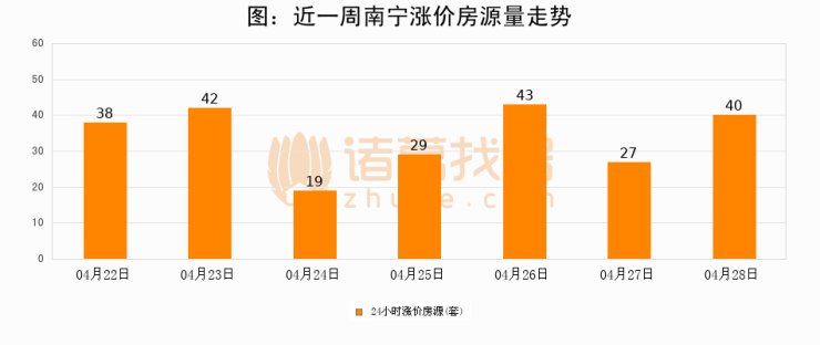根据诸葛找房数据显示,南宁24小时涨价房源量为40套,较04月27日增加13套,环比上涨48.1%。与此同时,涨价房源占比小幅扩大,业主信心有所提升。