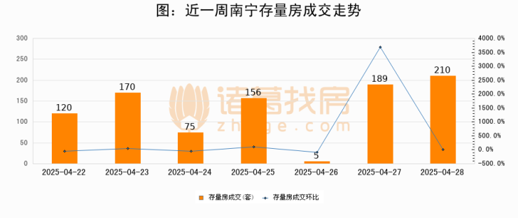 从存量房来看,2025年04月28日南宁存量房单日成交210套,比昨日增加21套,环比上涨11.1%。从近一周存量房成交来看,南宁存量房日均成交套数为132套,04月28日单日成交210套,高于近一周平均水平59.1%。