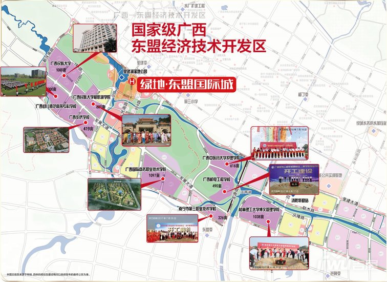 南宁教育园区计划引入16-19所高校,2018年年底将全面开工建设。目前广西民族大学、桂林理工大学博文管理学院、广西中医药大学护理管理学院、广西国际商务职业技术学院等十一所高校已成功签约,建成后将吸纳至少33-40万人口。