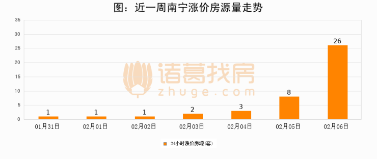 根据诸葛找房数据显示,南宁24小时涨价房源量为26套,较02月05日增加18套,环比上涨225%。与此同时,涨价房源占比小幅扩大,业主信心有所提升。