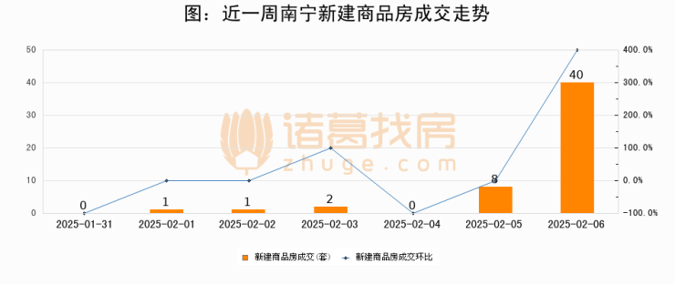根据南宁市住房和城乡建设局数据显示,2025年02月06日南宁新建商品房成交40套,较昨日增加32套,环比上涨400%