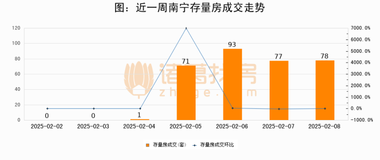 从存量房来看,2025年02月08日南宁存量房单日成交78套,比昨日增加1套,环比上涨1.3%。从近一周存量房成交来看,南宁存量房日均成交套数为45套,02月08日单日成交78套,高于近一周平均水平73.3%。