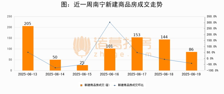 根据南宁市住房和城乡建设局数据显示,2025年06月19日南宁新建商品房成交86套,较昨日减少58套,环比下降40.3%。近一周南宁新建商品房日均成交110套。06月19日单日成交86套,低于近一周平均水平21.8%。