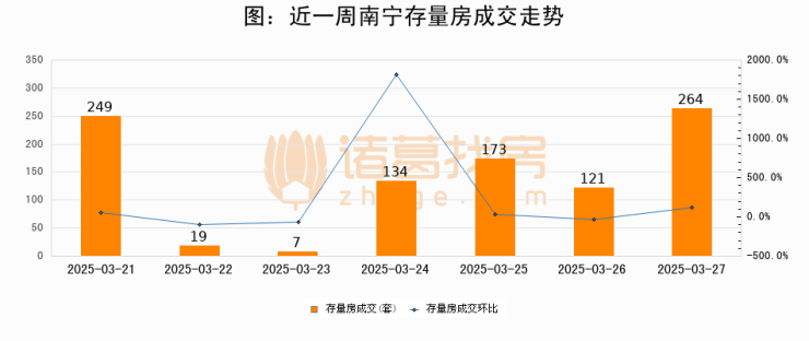从存量房来看,2025年03月27日南宁存量房单日成交264套,比昨日增加143套,环比上涨118.2%。从近一周存量房成交来看,南宁存量房日均成交套数为138套,03月27日单日成交264套,高于近一周平均水平91.3%。