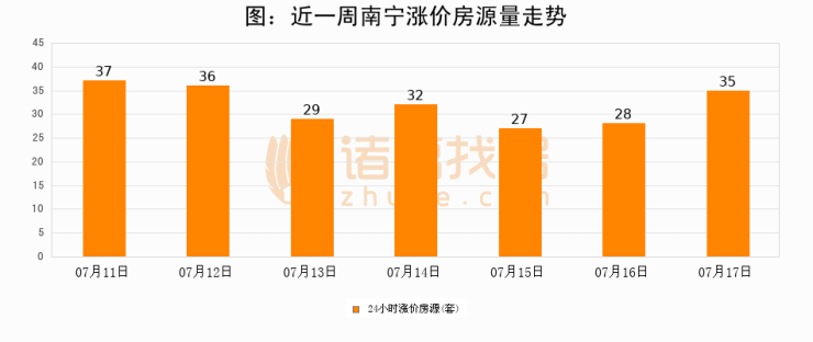 根据诸葛找房数据显示,南宁24小时涨价房源量为35套,较07月16日增加7套,环比上涨25%。与此同时,涨价房源占比小幅扩大,业主信心有所提升。