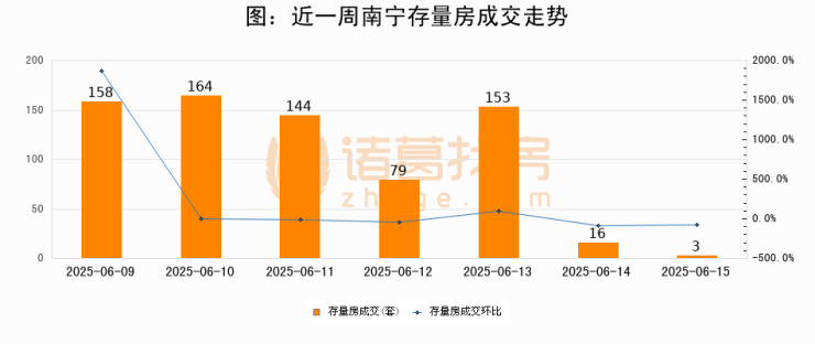 从存量房来看,2025年06月15日南宁存量房单日成交3套,比昨日减少13套,环比下降81.2%。从近一周存量房成交来看,南宁存量房日均成交套数为102套,06月15日单日成交3套,低于近一周平均水平97.1%。