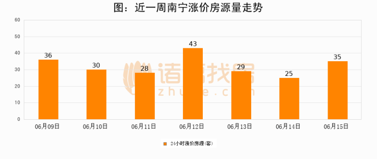 根据诸葛找房数据显示,南宁24小时涨价房源量为35套,较06月14日增加10套,环比上涨40%。与此同时,涨价房源占比小幅扩大,业主信心有所提升。
