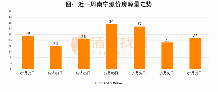根据诸葛找房数据显示,南宁24小时涨价房源量为27套,较07月08日增加4套,环比上涨17.4%。与此同时,涨价房源占比小幅扩大,业主信心有所提升。