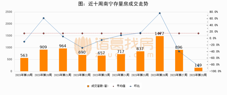 存量房方面,第28周南宁存量房成交149套,较上周减少747套,环比下降83.4%。从近十周成交走势来看,周均成交套数为785套,本周低于平均水平81%。