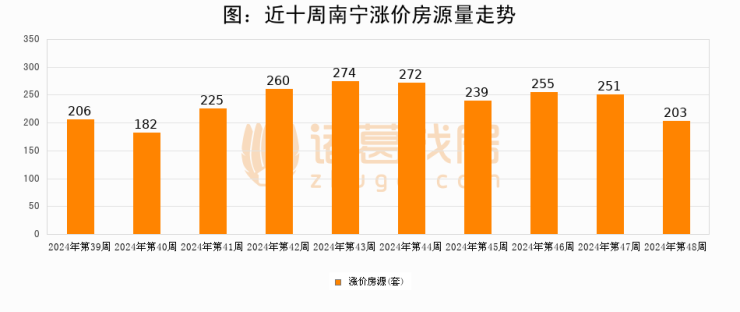 从调价房源来看,第48周南宁涨价房源203套,较上周下降19.1%。与此同时,48周涨价房源占比回落3.29个百分点,业主信心小幅波动,购房者可则需入市。