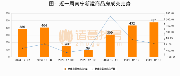 根据南宁市住房和城乡建设局数据显示,2023年12月13日南宁新建商品房成交474套,较昨日增加42套,环比上涨9.7%