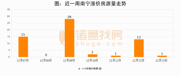 根据诸葛找房数据显示,南宁24小时涨价房源量为1套,较12月12日减少12套,环比下降92.3%。与此同时,涨价房源占比小幅回落,对于购房者来说是一个入市窗口期,购房者可抓住时机入市。