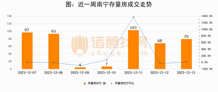 从存量房来看,2023年12月13日南宁存量房单日成交79套,比昨日增加11套,环比上涨16.2%。从近一周存量房成交来看,南宁存量房日均成交套数为64套,12月13日单日成交79套,高于近一周平均水平23.4%。