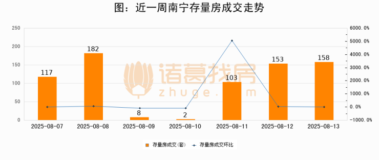 从存量房来看,2025年08月13日南宁存量房单日成交158套,比昨日增加5套,环比上涨3.3%。从近一周存量房成交来看,南宁存量房日均成交套数为103套,08月13日单日成交158套,高于近一周平均水平53.4%。