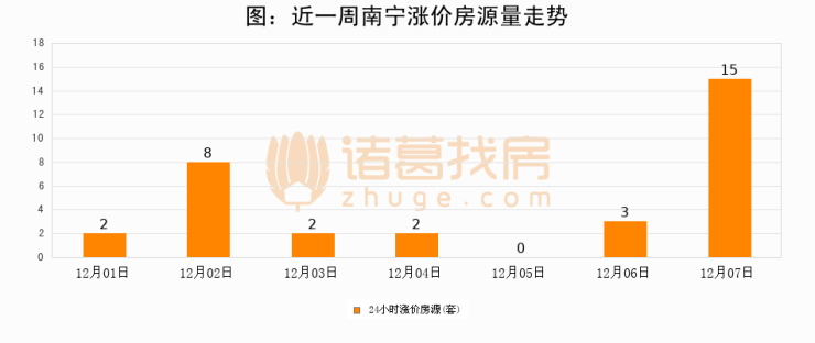 根据诸葛找房数据显示,南宁24小时涨价房源量为15套,较12月06日增加12套,环比上涨400%。与此同时,涨价房源占比小幅扩大,业主信心有所提升。