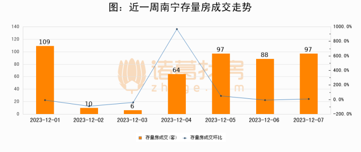 从存量房来看,2023年12月07日南宁存量房单日成交97套,比昨日增加9套,环比上涨10.2%。从近一周存量房成交来看,南宁存量房日均成交套数为67套,12月07日单日成交97套,高于近一周平均水平44.8%。