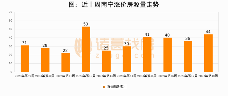 从调价房源来看,第48周南宁涨价房源44套,较上周上涨22.2%。与此同时,48周涨价房源占比提升0.83个百分点,业主信心持续恢复。