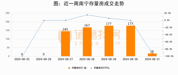从存量房来看,2024年08月31日南宁存量房单日成交16套,比昨日减少161套,环比下降91%。从近一周存量房成交来看,南宁存量房日均成交套数为97套,08月31日单日成交16套,低于近一周平均水平83.5%。