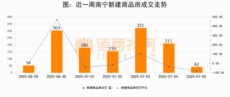 根据南宁市住房和城乡建设局数据显示,2025年07月05日南宁新建商品房成交42套,较昨日减少169套,环比下降80.1%。近一周南宁新建商品房日均成交181套。07月05日单日成交42套,低于近一周平均水平76.8%。