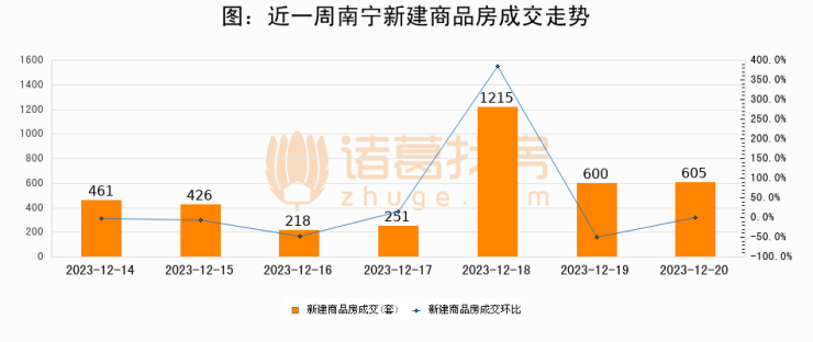 根据南宁市住房和城乡建设局数据显示,2023年12月20日南宁新建商品房成交605套,较昨日增加5套,环比上涨0.8%