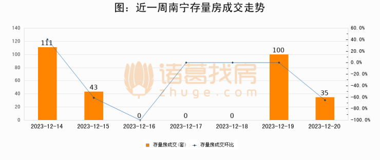 从存量房来看,2023年12月20日南宁存量房单日成交35套,比昨日减少65套,环比下降65%。从近一周存量房成交来看,南宁存量房日均成交套数为41套,12月20日单日成交35套,低于近一周平均水平14.6%。