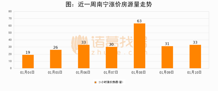 根据诸葛找房数据显示,南宁24小时涨价房源量为33套,较01月09日增加2套,环比上涨6.5%。与此同时,涨价房源占比小幅扩大,业主信心有所提升。