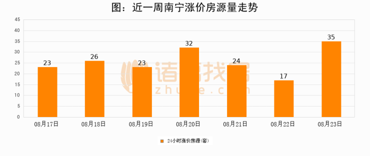 根据诸葛找房数据显示,南宁24小时涨价房源量为35套,较08月22日增加18套,环比上涨105.9%。与此同时,涨价房源占比小幅扩大,业主信心有所提升。