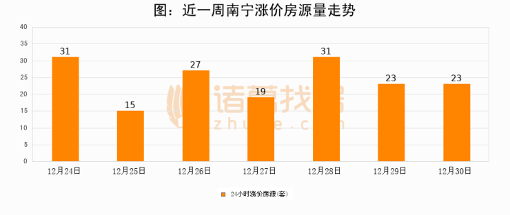 根据诸葛找房数据显示,南宁24小时涨价房源量为23套,较12月29日持平。