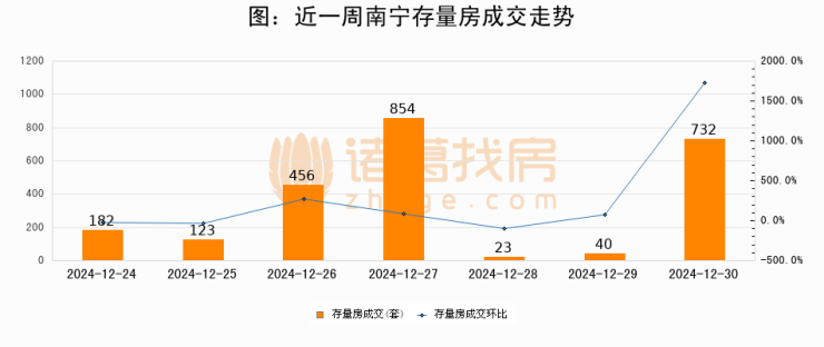从存量房来看,2024年12月30日南宁存量房单日成交732套,比昨日增加692套,环比上涨1730%。从近一周存量房成交来看,南宁存量房日均成交套数为344套,12月30日单日成交732套,高于近一周平均水平112.8%。